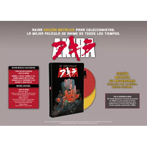 Sinopsis de AKIRA: Año 2019. Neo-Tokyo, una ciudad construida sobre la antigua capital japonesa destruida tras la Tercera Guerra Mundial. Japón es un país al borde del colapso enfrentado en continuas crisis políticas. En secreto, un equipo de científicos ha reactivado por orden del ejército un experimento para encontrar a sujetos que puedan controlar el arma definitiva: una fuerza denominada la energía absoluta. Pero los habitantes de Neo-Tokyo tienen otras cosas de las que preocuparse. Uno de ellos es Kaneda, un joven pandillero líder de una banda de motoristas. Durante una pelea, su mejor amigo, Tetsuo, sufre un extraño accidente y termina ingresado en unas instalaciones militares. Allí los científicos descubrirán que es el poseedor de la energía absoluta. Pero Tetsuo no se resignará a convertirse en un conejillo de indias... y muy pronto se convertirá en la amenaza más grande que el mundo ha conocido.