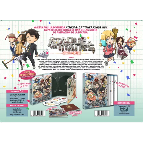 Sinopsis: Eren Jaeger odia a los Titanes desde el día en que se encontró cara a cara con uno que le robó su almuerzo. Ese momento traumático le llevó a tomar la decisión de terminar con ellos y así poder proteger la comida de sus compañeros del voraz apetito de estas gigantescas criaturas. Sin embargo, ahora empieza las clases de secundaria junto a Mikasa y Armin en el Instituto Titán, donde humanos y Titanes comparten instalaciones. ¿Se llegarán a entender entre ellos o el enfrentamiento será inevitable? Bienvenidos a la parodia cómica de la popular serie Ataque a los Titanes donde los personajes principales del anime en versión "chibi" asisten a un instituto donde se miden a su particular manera con las criaturas que aterrorizan a la humanidad.