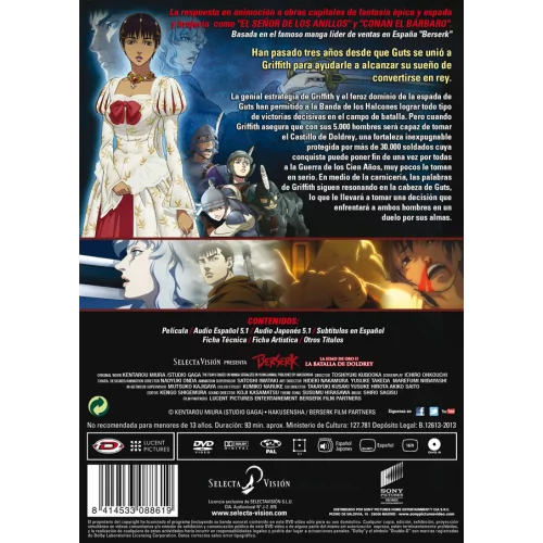 Sinopsis: Han pasado tres años desde que Guts se unió a Griffith para ayudarle a alcanzar su sueño de convertirse en rey. La genial estrategia de Griffith y el feroz dominio de la espada de Guts han permitido a la Banda de los Halcones Logra todo tipo de victorias decisivas en el campo de batalla.