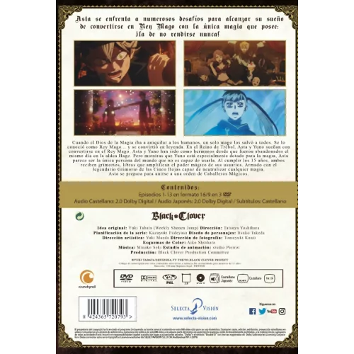 Sinopsis: Cuando el Dios de la Magia iba a aniquilar a los humanos, un solo mago los salvó a todos. Se lo conoció como Rey de los Magos... y se convirtió en leyenda. En el Reino de Clover, Asta y Yuno sueñan con convertirse en el Rey de los Magos. Asta y Yuno han sido como hermanos desde que fueron abandonados el mismo día en la aldea Hage. Pero mientras que Yuno está especialmente dotado para la magia, Asta parece ser la única persona del mundo que no es capaz de usarla. Al cumplir los 15 años, ambos reciben grimorios, libros que amplifican el poder mágico de sus usuarios. Armado con el legendario Grimorio de las Cuatro Hojas capaz de neutralizar cualquier magia, Asta se prepara para unirse a una orden de Caballeros Magos con la única magia que posee: ¡la de no rendirse nunca!