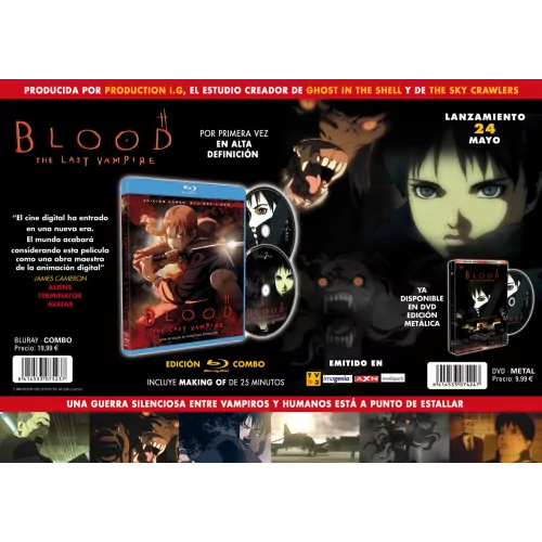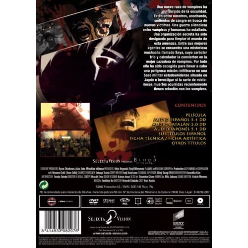 Sinopsis: La guerra entre humanos y vampiros ha estallado.Una nueva raza de vampiros ha surgido de la oscuridad. Están entre nostros, acechando, sedientos de sangre en busca de nuevas víctimas. Una guerra silenciosa entre vampiros y humanos ha estallado y una organización secreta ha sido designada para limpiar el mundo de esta amenaza. Entre sus mejores agentes se encuentra una misteriosa muchacha llamada Saya, cuyo carácter frío y calculador la convierte en la mejor cazadora de vampiros. Por todo ello ha sido escogida para llevar a cabo una peligrosa misión: infiltrarse en una base militar estadounidense situada enJapón e investigar si laSerie de misteriosas muertes ocurridas recientemente tienen relación con los vampiros.