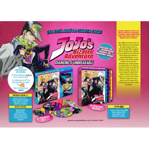 Sinopsis: Cuando malignos usuarios de stand comienzan a amenazar su ciudad, Josuke Higashikata debe hacer frente tanto a su legado como su destino. Año 1999, han transcurrido 11 años desde la lucha a muerte de Jotaro Kujo contra su archienemigo DIO en Egipto. Ahora, Jotaro viaja a Morioh en la ciudad S de la prefectura M de Japón para buscar a Josuke Higashikata, el hijo secreto de su abuelo Joseph Joestar. Al encontrarlo, descubre que Josuke posee su propio stand y de repente, como si la visita de Jotaro los hubiera atraído, aparece un nuevo grupo de usuarios de stand. Josuke tendrá que pasar a la acción para salvar Morioh, el lugar en el que nació y se ha criado, de la amenaza que se cierne sobre la ciudad.