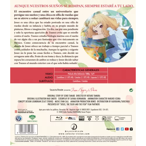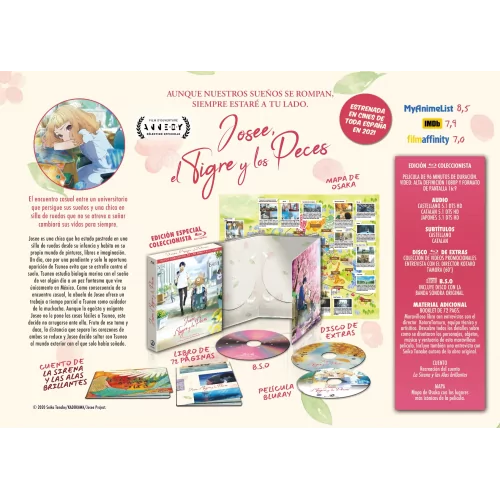Sinopsis Josee, el Tigre y los Peces: Josee es una chica que ha estado postrada en una silla de ruedas desde su infancia y habita en su propio mundo de pinturas, libros e imaginación. Un día, cae por una pendiente y solo la oportuna aparición de Tsuneo evita que se estrelle contra el suelo. Tsuneo estudia biología marina con el sueño de ver algún día a un pez fantasma que vive únicamente en México. Como consecuencia de su encuentro casual, la abuela de Josee ofrece un trabajo a tiempo parcial a Tsuneo como cuidador de la muchacha. Aunque la egoísta y exigente Josee no le pone las cosas fáciles a Tsuneo, este decide no arrugarse ante ella. Fruto de ese toma y daca, la distancia que separa los corazones de ambos se reduce y Josee decide saltar con Tsuneo al mundo exterior con el que solo había soñado.