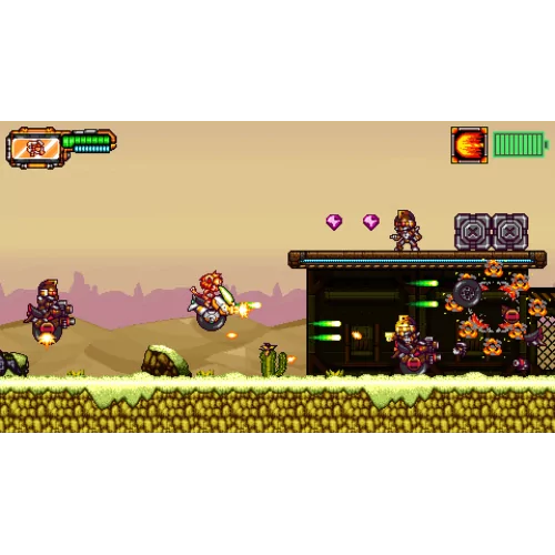 Ponte en la piel de 3 androides "Predator" para defender su mundo contra el ejército de robots de Lucian Corp. Cada personaje jugable ofrece ventajas distintas. Erika puede inundar la pantalla con disparos de bala, Zeta utiliza el trueno atómico para golpear fuerte y rápido, mientras que Neva emplea un jetpack para volar a través de los niveles y atacar desde arriba. Como uno de estos guerreros, tendrás que atravesar bosques, desiertos, cuevas y campos de nieve para detener a los invasores antes de que agoten los recursos del planeta y alimenten una guerra galáctica.