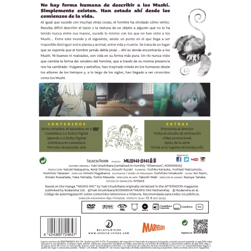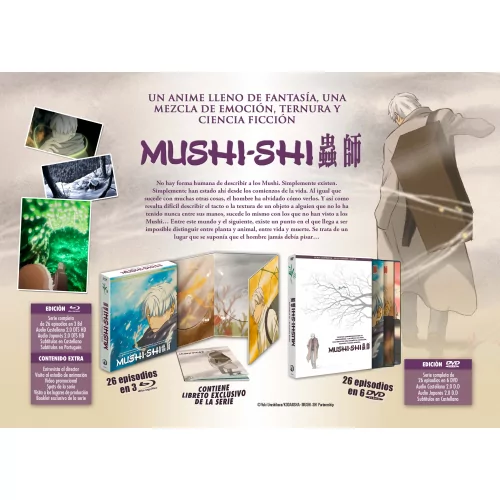Al igual que sucede con muchas otras cosas, el hombre ha olvidado cómo verlos. Resulta difícil describir el tacto o la textura de un objeto a alguien que no lo ha tenido nunca entre sus manos, sucede lo mismo con los que no han visto a los Mushi... Entre este mundo y el siguiente, existe un punto en el que llega a ser imposible distinguir entre planta y animal, entre vida y muerte. Se trata de un lugar que se suponía que el hombre amás debía pisar... Ahí es donde encontrarás a los Mushi. Ni buenos ni malvados, son vida en su forma más pura. Un río nunca visto que cambia la forma del sendero del hombre, que a través de su misma presencia nos ha cambiado. Vulgares y extraños, han inspirado miedo en los humanos desde los albores de los tiempos y, a lo largo de los siglos, han llegado a ser conocidos como los Mushi.