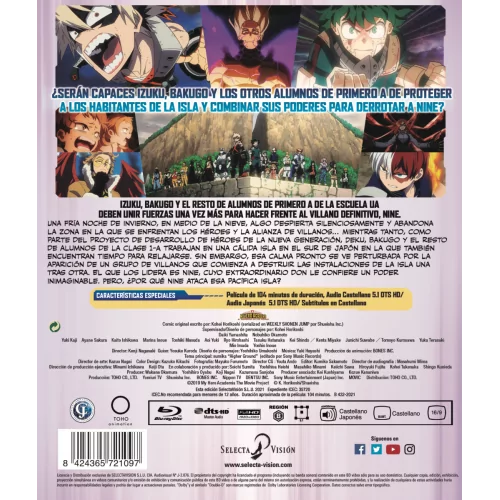 Sinopsis: Izuku, Bakugo y el resto de alumnos de Primero A de la Escuela UA deben unir fuerzas una vez más para hacer frente al villano definitivo, Nine. Una fría noche de invierno, en medio de la nieve, algo despierta silenciosamente y abandona la zona en la que se enfrentan los héroes y la Alianza de Villanos… Mientras tanto, Izuku y los otros estudiantes de la Escuela UA son enviados a trabajar como héroes a una cálida isla en el sur de Japón en la que también encuentran tiempo para relajarse. Sin embargo, esa calma pronto se ve perturbada por la aparición de un grupo de villanos que comienza a destruir las instalaciones de la isla una tras otra. El que los lidera es Nine, cuyo extraordinario don le confiere un poder inimaginable. Pero, ¿por qué Nine ataca esa pacífica isla? ¿Serán capaces Izuku, Bakugo y los otros alumnos de Primero A de proteger a los habitantes de la isla y combinar sus poderes para derrotar a Nine?