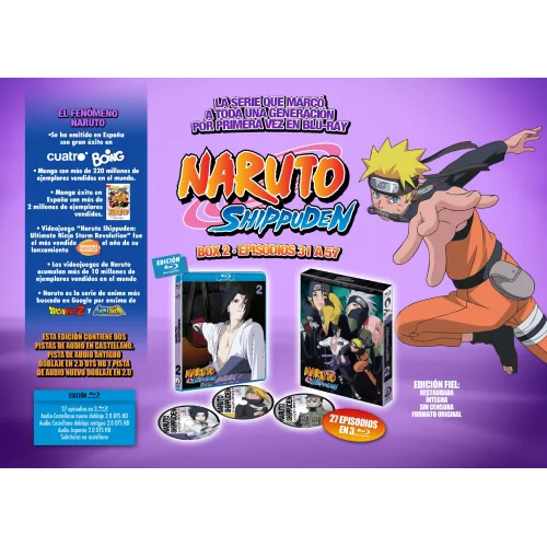 Llega el box 1 de Naruto Shippuden con los episodios 1 al 30. Disfruta por primera vez en formato físico de una de las series más relevantes del siglo XXI, en una edición íntegra y sin censura, elige entre el doblaje clásico y un nuevo doblaje preparado para la ocasión, y sigue disfrutando de las aventuras del ninja más famoso del mundo, por primera vez en DVD y Bluray.
