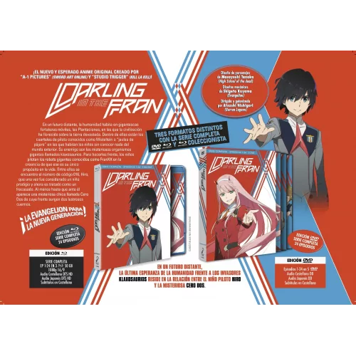 Sinopsis: En un futuro distante, la humanidad habita en gigantescas fortalezas móviles, las Plantaciones, en las que la civilización ha florecido sobre la tierra devastada. Dentro de ellas están los cuarteles de piloto conocidos como Misteltein o “jaulas de pájaro” en las que habitan los niños sin conocer nada del mundo exterior. Su enemigo son los misteriosos organismos gigantes llamados klaxosaurios. Para hacerles frente, los niños pilotan los robots gigantes conocidos como FranXX en la creencia de que ese es su único propósito en la vida. Entre ellos se encuentra el número de código 016, Hiro, que una vez fue considerado un niño prodigio y ahora es tratado como un fracasado. Al menos hasta que ante él aparece una misteriosa chica llamada Cero Dos de cuya frente surgen dos lustrosos cuernos.