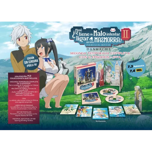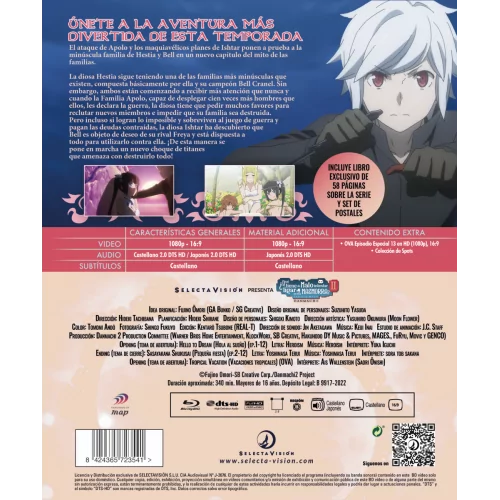 ¡Continúan las aventuras de Bell Cranel y la Familia Hestia! Por primera vez doblada al castellano y sin censura, vive la tercera temporada de Danmachi, adéntrate de nuevo en la Mazmorra y conoce las nuevas criaturas de las profundidades, ya sea en DVD o con la edición coleccionista en bluray, que incluye también la OVA correspondiente a la tercera temporada.