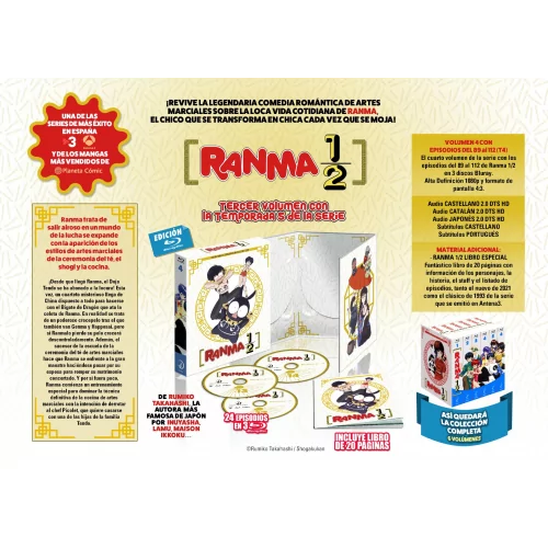 Llega el penúltimo box de la colección de Ranma 1/2, con los episodios 113 al 135 de la mítica serie creada por Rumiko Takahashi. Un nuevo compañero de clase, un misterioso maestro de caligrafía, medicinas misteriosas, una visita al parque de atracciones, una sandía, Nochebuena y Navidad o Ukyo sufriendo una crisis de okonomiyaki; acompaña a Ranma y Akane en más disparatadas aventuras pasadas por agua, por primera vez completa en DVD y en Bluray.